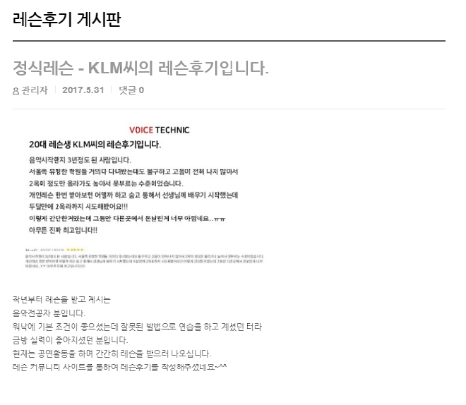 정식레슨 - KLM씨의 레슨후기입니다. 출처 - 보이스테크닉 모두홈페이지
