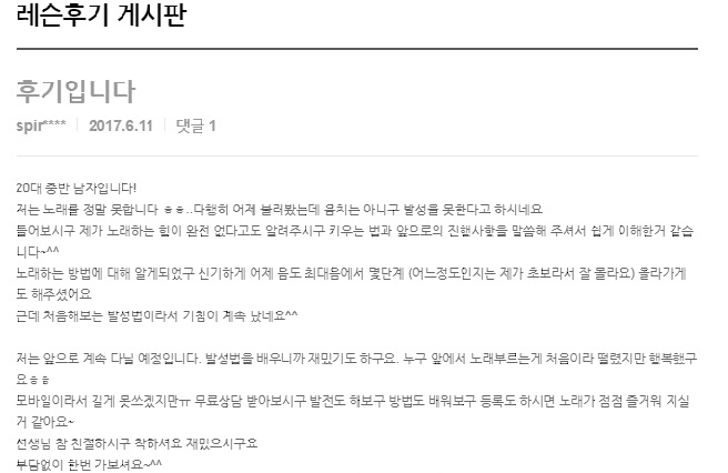 후기입니다. 출처 - 보이스테크닉 모두홈페이지 > 레슨후기